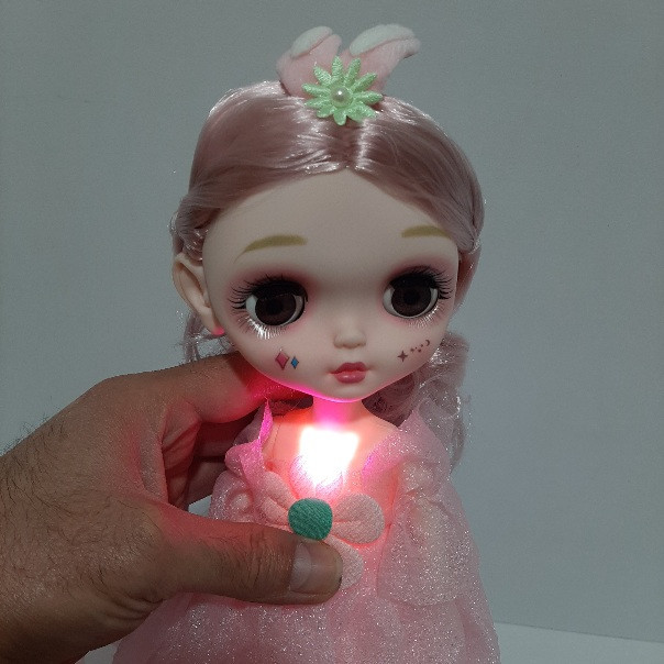 برای فعال شدن موزیک از پشت عروسک برگه ی پلمپ را بیرون بکشید و دکمه ی روی سینه عروسک را فشار دهید.